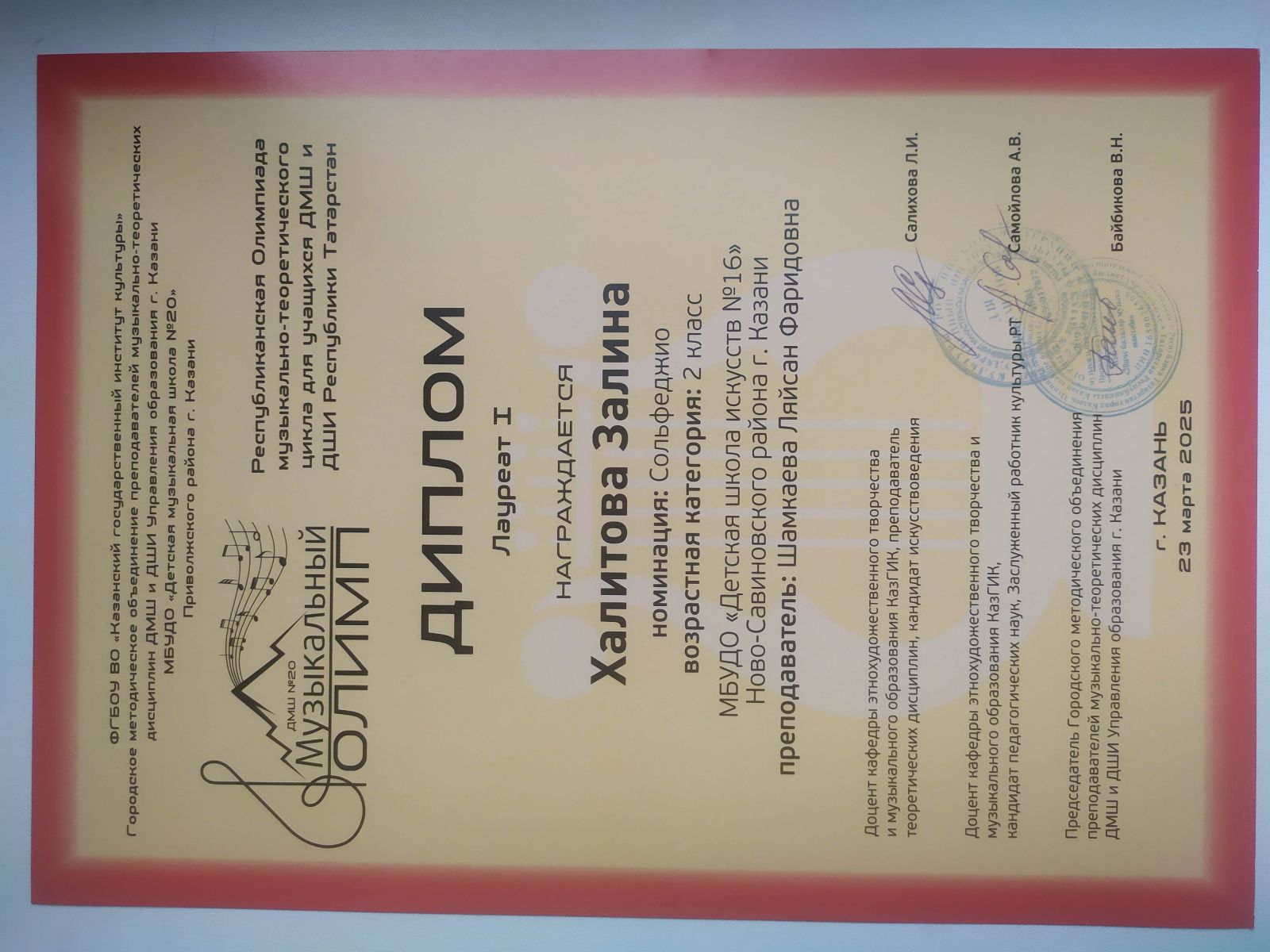 42. Халитова Залина - лауреат 1 степени. Республиканская олимпиада «Музыкальный олимп»