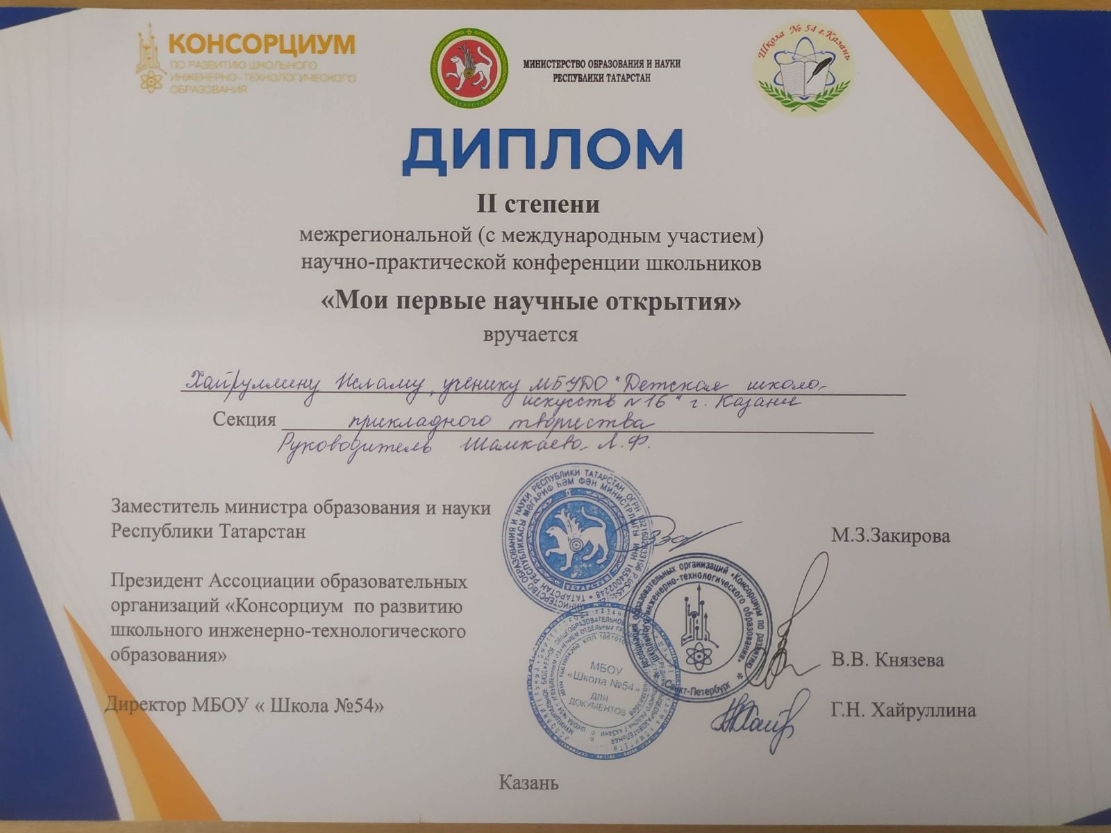 58. Хайруллин Ислам - диплом 2 степени. Межрегиональная (с международным участием) научно-практическая конференция школьников «Мои первые научные открытия»