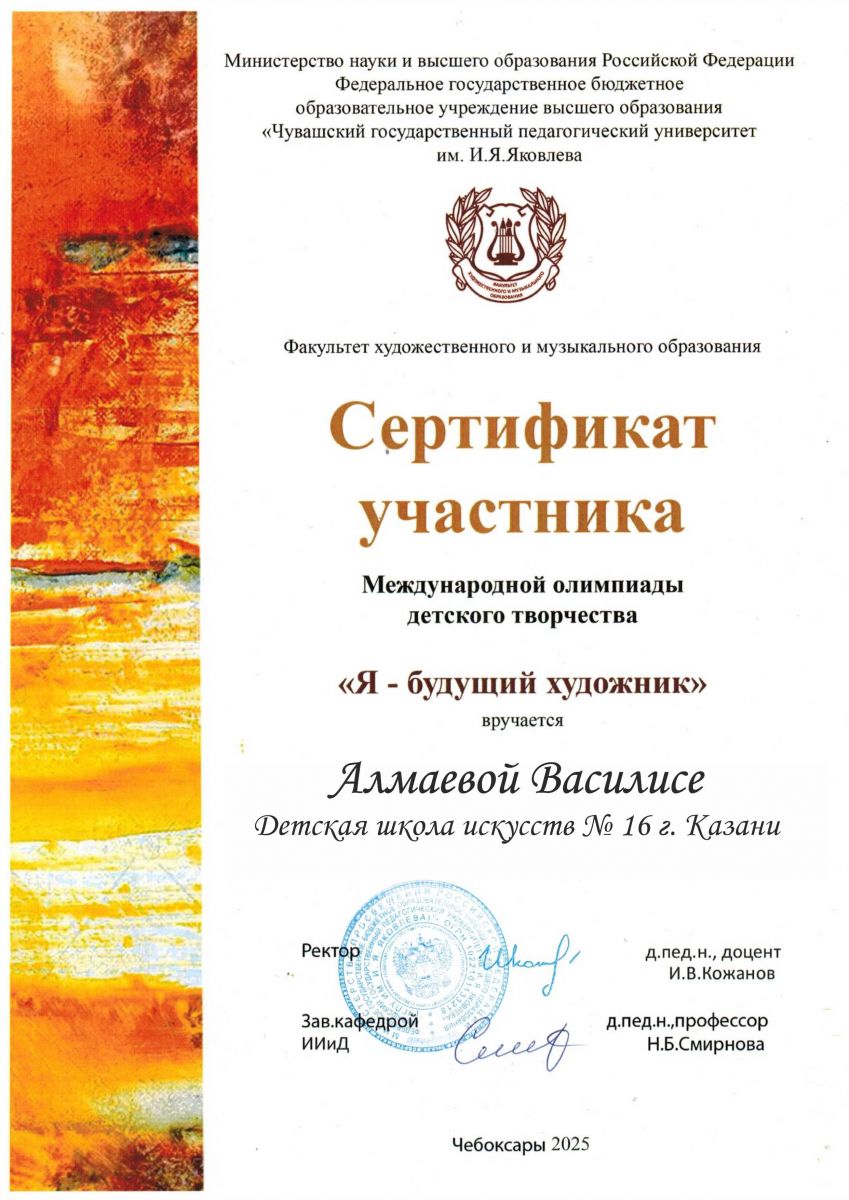 3. Алмаева Василиса - сертификат участника. Международная олимпиада детского творчества «Я – будущий художник»