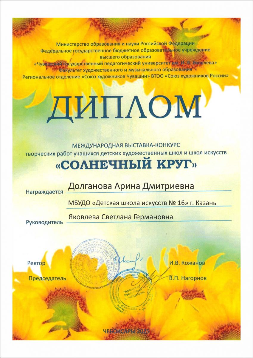 5. Долганова Арина. Диплом. Международная выставка-конкурс «Солнечный круг»