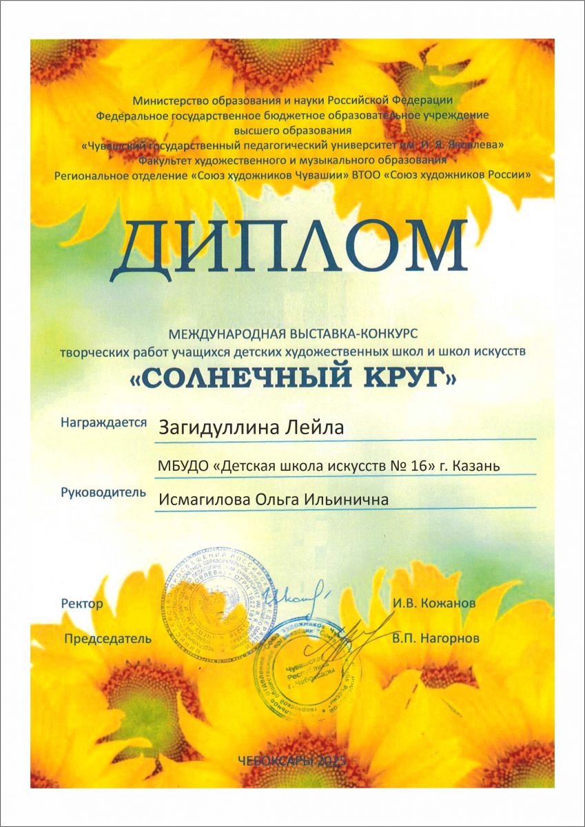 4. Загидуллина Лейла. Диплом. Международная выставка-конкурс «Солнечный круг»