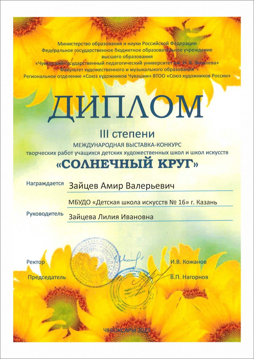43. Зайцев Амир. Диплом 3 степени. Международная выставка-конкурс «Солнечный круг»