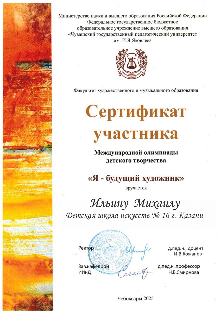 2. Ильин Михаил - сертификат участника. Международная олимпиада детского творчества «Я – будущий художник»