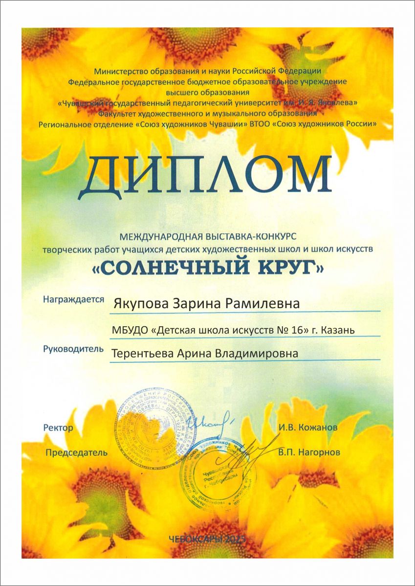3. Якупова Зарина. Диплом. Международная выставка-конкурс «Солнечный круг»