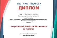 Педагог дополнительного образования "ЦВР" Ново-Савиновского района г.Казани Лаврентьева Наталья Николаевна (объединение "Знатоки химии") приняла участие во всероссийском конкурсе "Одарённые дети" и была награждена Дипломом за I место. Наши поздравления!!!!