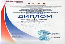 В Республиканском конкурсе-фестивале «Патриоты России» учащийся объединения «Ручное ткачество» Медведев Дмитрий (педагог дополнительного образования отдела художественно-прикладного творчества Зайцева Ирина Ивановна) награжден Дипломом Лауреата I степени в номинации «Прикладное творчество» за работу «Победители»