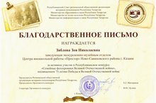 25 сентября 2020 года на заседании Президиума Республиканского Совета региональной общественной организации ветеранов (пенсионеров) Республики Татарстан подведены итоги и состоялась церемония награждения победителей Республиканского конкурса «Семейные фотохроники Великой Отечественной войны» в рамках подготовки 75-летию Победы в Великой Отечественной войне. За большую работу по организации и проведению Конкурса в 2019/2020 учебном году Благодарственным письмом Республиканского Совета региональной общественной организации ветеранов (пенсионеров) Республики Татарстан награждена Зяблова Зоя Николаевна, заведующая экскурсионно-музейным отделом МБУДО ДДЮТиЭ "Простор". Поздравляем Зою Николаевну и желаем дальнейших успехов!