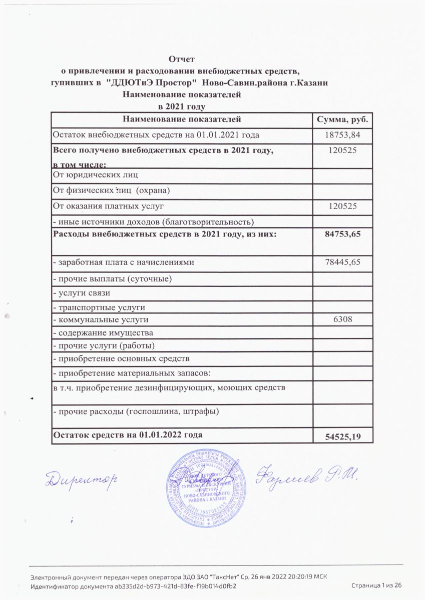 - Отчет о привлечении и расходовании внебюджетных средств, поступивших в МБУДО ДДЮТиЭ "Простор" в 2021 году