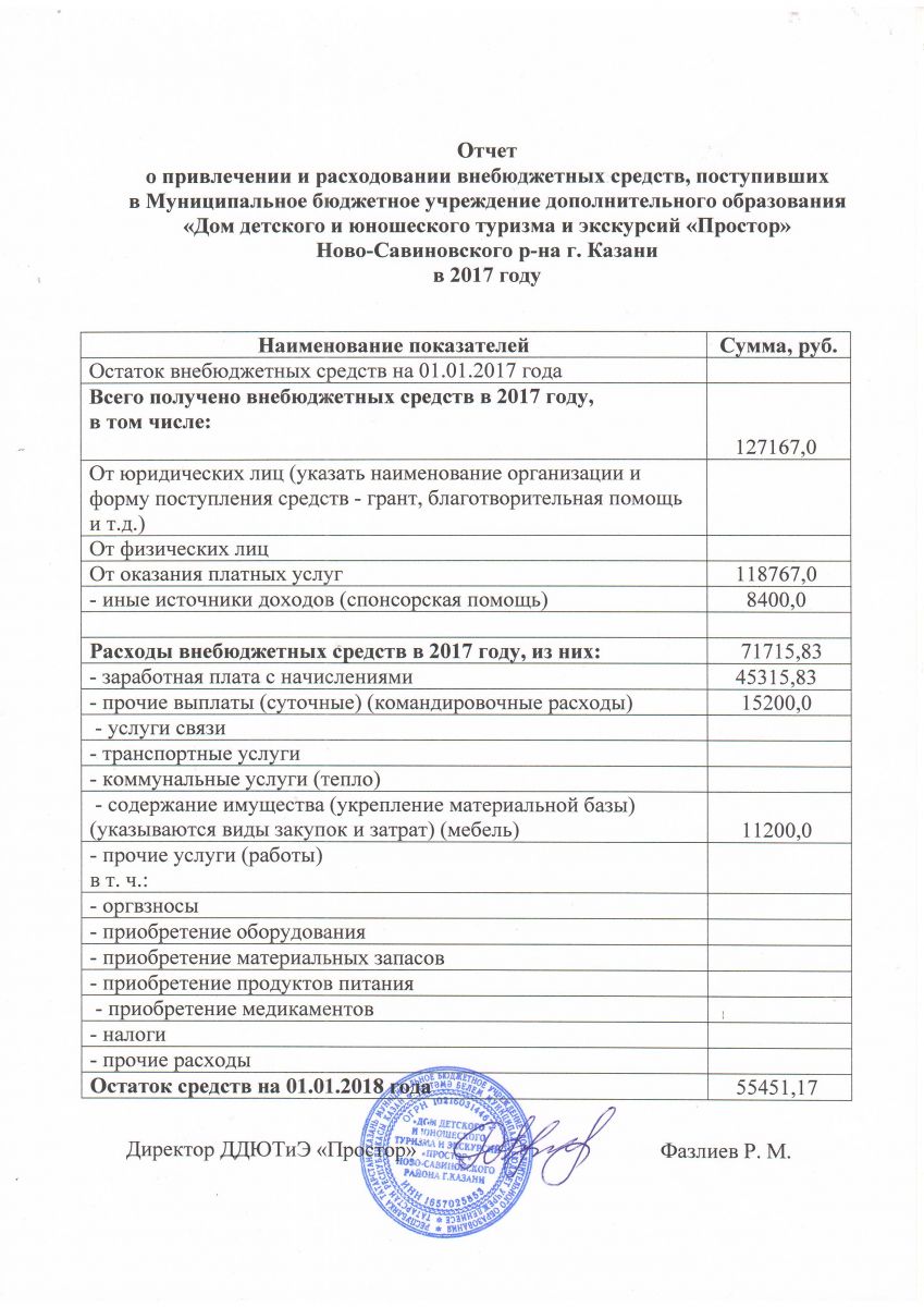- Отчет о привлечении и расходовании внебюджетных средств, поступивших в МБУДО ДДЮТиЭ "Простор" в 2017 году