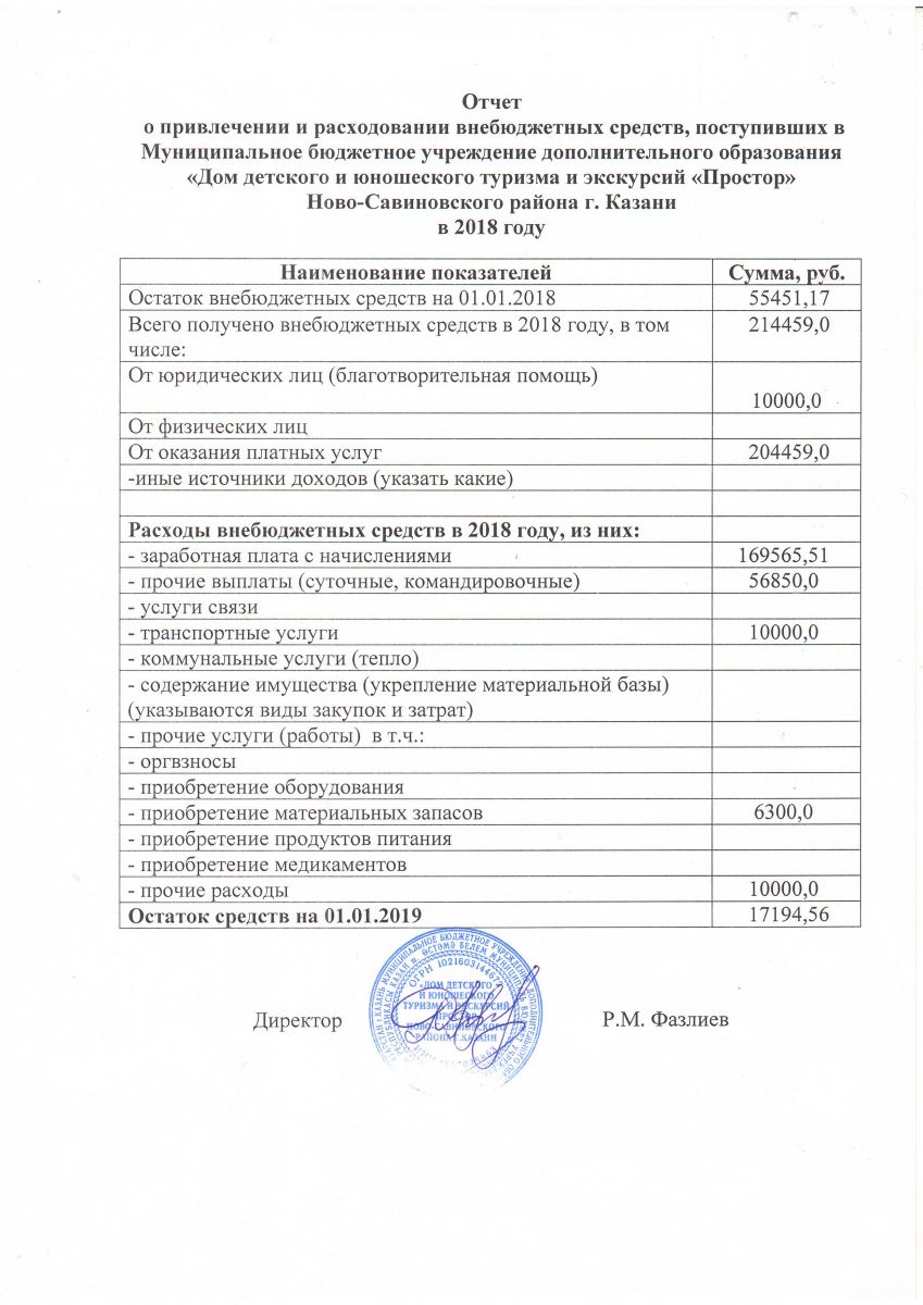 - Отчет о привлечении и расходовании внебюджетных средств, поступивших в МБУДО ДДЮТиЭ "Простор" в 2018 году