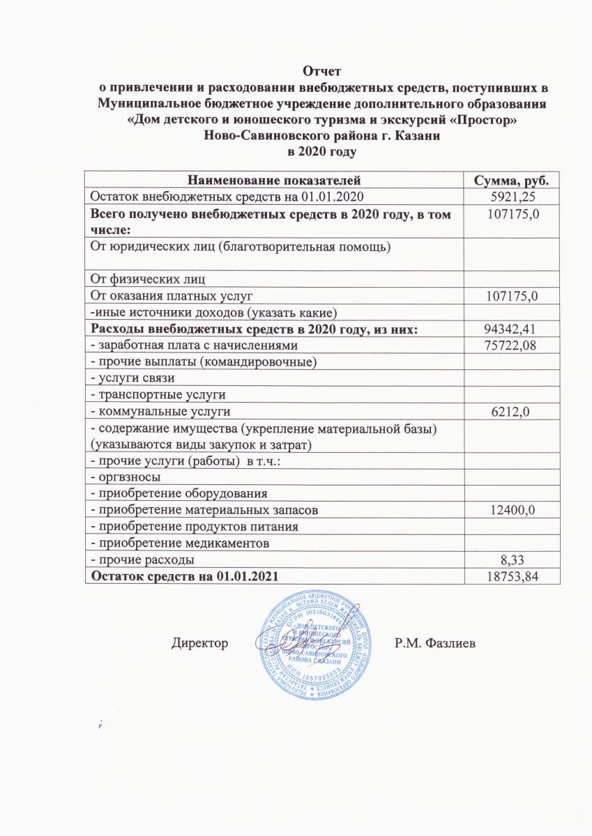 - Отчет о привлечении и расходовании внебюджетных средств, поступивших в МБУДО ДДЮТиЭ "Простор" в 2020 году