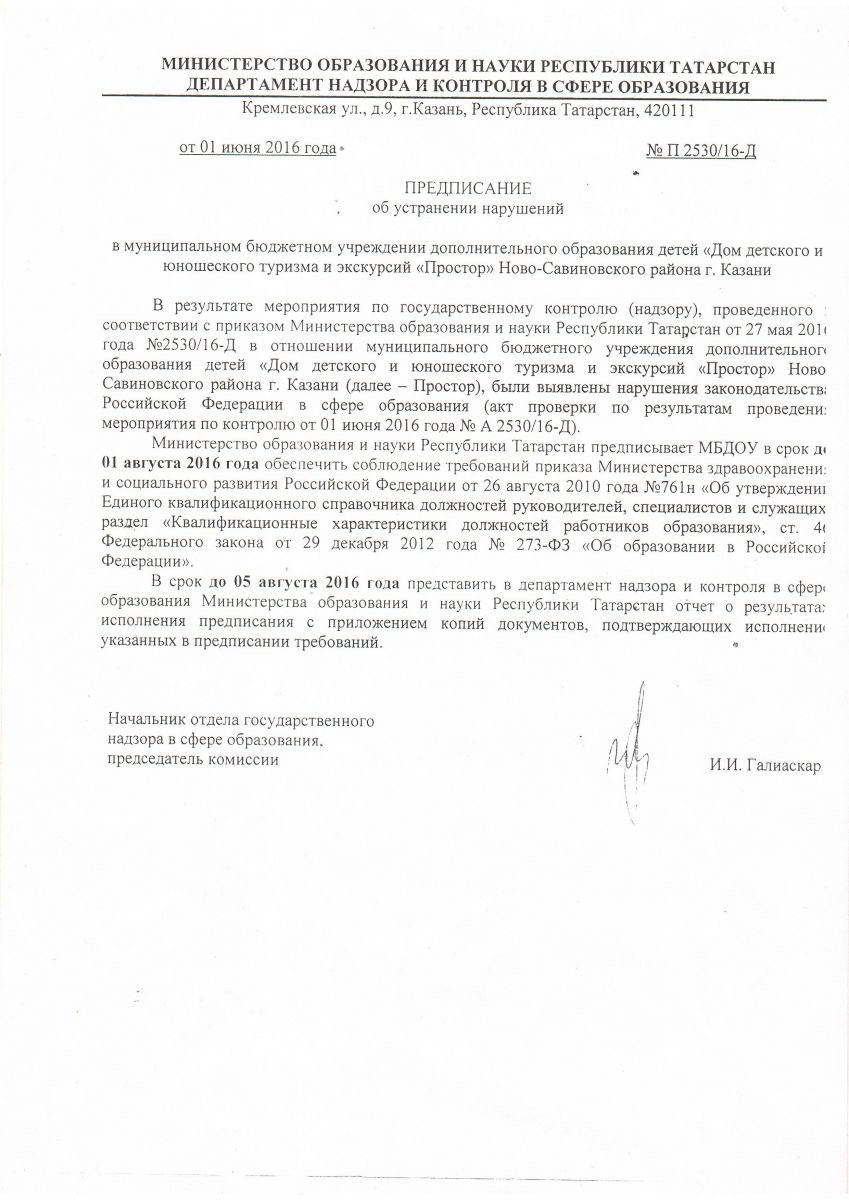 - Предписание департамента надзора и контроля в сфере образования Министерства образования и науки Республики Татарстан от 27 мая 2016 года № 2530/16-Д