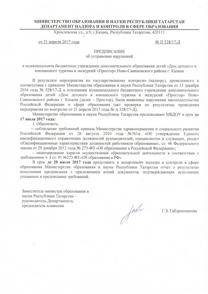 - Предписание департамента надзора и контроля в сфере образования Министерства образования и науки Республики Татарстан от 21 апреля 2017 года № П 528/17-Д