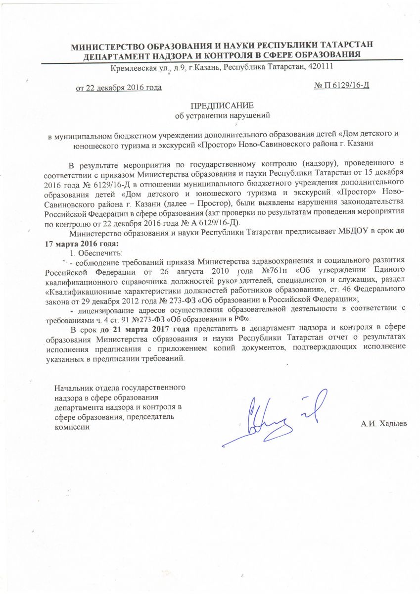 - Предписание департамента надзора и контроля в сфере образования Министерства образования и науки Республики Татарстан от 22 декабря 2016 года № П 6129/16-Д