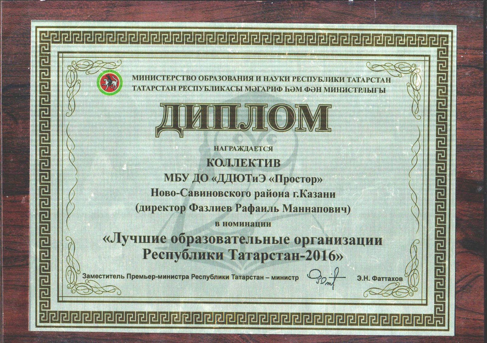 Награждение дипломом и кубком МОиН РТ в номинации «Лучшие образовательные организации Республики Татарстан – 2016».