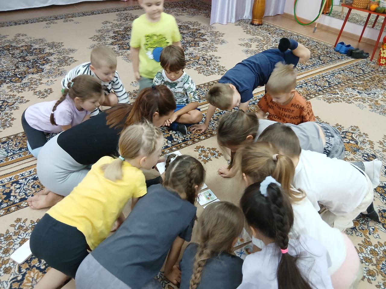 Нашей последней гостьей была мама Нурпеисова Сэма - Ксения Владимировна, которая работает инструктором йоги. Она рассказала детям об основных позах йоги, показывая карточки с их изображением.