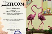 Поздравляем воспитанницу 9 группы Манылову Наталью, занявшую 1 место в Международном конкурсе декоративно-прикладного творчества "Мастерская умельцев", в номинации "Свободная техника". Желаем дальнейших успехов и творческих побед!