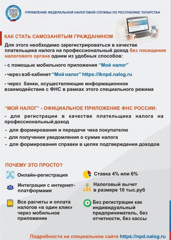 Управлением Федеральной налоговой службы России по Республике Татарстан в рамках реализации пилотного проекта по применению специального налогового режима "Налог на профессиональный доход" на территории Республики Татарстан разработан материал для самозанятых граждан.