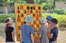 Наши старшие дошколята, которые в течение учебного года посещают кружок шахмат "Ход конем", в преддверии дня шахмат разыграли партию на свежем воздухе. -