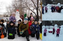 Во время прогулки ребята не теряли время зря, а творили скульптуры снеговиков на своих участках.