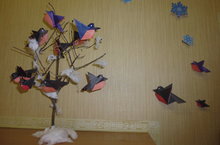 В рамках тематической недели "Зимующие птицы" старшая группа №9 совместно с воспитателем Малыгиной Т.И. сделали коллективную работу "Снегири на ветке"
