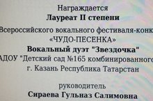 Поздравляем дуэт "Звездочка" (Карлов Данил и Хабиева Мадина), который под руководством музыкального руководителя Сираевой Гульназ Салимовны стал Лауреатом II степени во Всероссийском вокальном фестивале-конкурсе "Чудо-песенка".