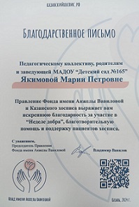 Наш педагогический коллектив, родители и воспитанники детского сада приняли участие в акции "Неделя Добра". Все вырученные средства были направлены в фонд имени Анжелы Вавиловой на благотворительную помощь и поддержку пациентов хосписа.
