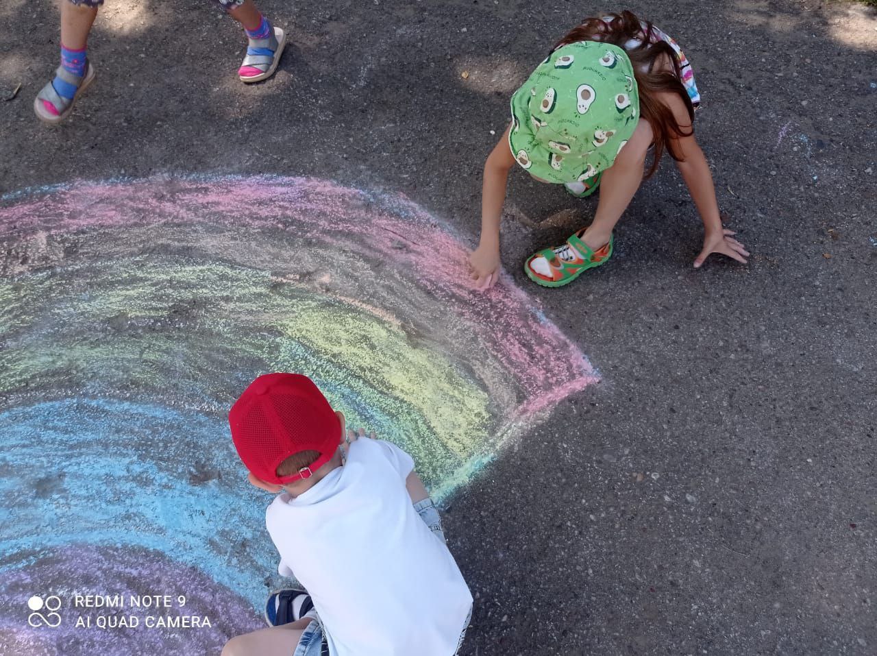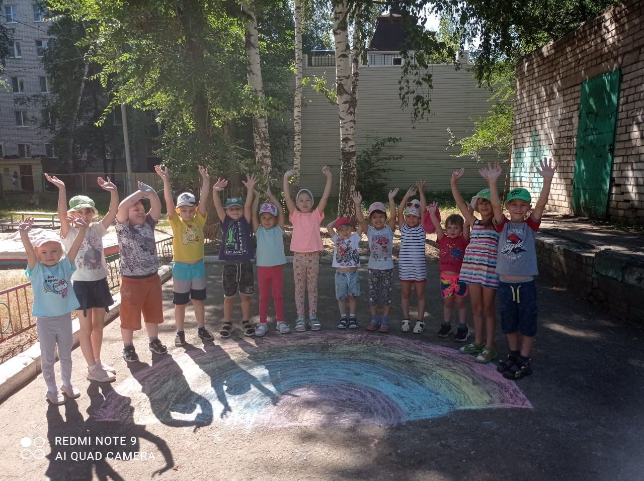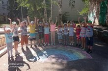Воспитатели вместе с воспитанниками окунулись в радужные краски, нарядились в разные цвета. Ребята поиграли в подвижную игру «Солнышко и дождик», «Цветные автомобили». В завершении тематического занятия дети нарисовали коллективный рисунок на асфальте мелками - «Разноцветная радуга».