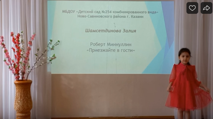 Поздравляем воспитанницу логопедической группы номер 6 Шамсетдинову Залию, занявшую третье место в районном конкурсе чтецов "Мир детства - мир чудес!", среди логопедических групп дошкольных образовательных организаций Авиастроительного и Ново-савиновского районов г. Казани, в возрасте от 5 до 7 лет, в номинации "Стихи поэтов юбиляров", Залия прочитала стихотворение Роберта Миннуллина "Приезжайте в гости". Подготовила конкурсантку учитель-логопед Нутфуллина Роза Шайдулловна .