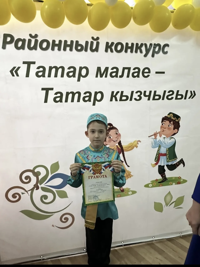Район куләмендә оештырылган " Татар малае һәм татар кызчыгы" конкурсында мәктәпкә әзерлек төркеме тәрбияләнүчесе Гайнетдинов Рамазан Гран При дәрәҗәсенә лаек булды. Без аны бу уңышы белән котлыйбыз һәм яңадан -яңа унышлар теләп калабыз!
