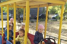 В один из погожих сентябрьских деньков мы с детьми совершили увлекательную, занимательную и познавательную прогулку на тему «Мы по садику гуляли…», и отправились в путь на весёлом паровозике. Двигаясь вперёд по дорожкам участка, малыши хором проговаривали: «Утром небо было хмурым, и казалось все понурым. Осень очень любит плакать, дождиком на землю капать. Любит листьями шуршать, и с деревьев их срывать».