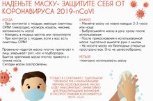 Индивидуальная профилактика гриппа, ОРВИ, в том числе коронавирусной инфекции СОУГО-19ПРАВИЛО 1. МОЕМ РУКИ• Мойте руки с мылом после посещения любых общественных мест, транспорта, прикосновений к дверным ручкам, деньгам, оргтехнике, перед едой и приготовлением пищи.• При отсутствии доступа к воде и мылу необходимо использовать дезинфицирующие средства или одноразовые влажные салфетки.• Не прикасайтесь к лицу и глазам немытыми руками.• Не пользуйтесь общими полотенцами.ПРАВИЛО 2. СОБЛЮДАЕМ ГИГИЕНУ РАБОЧЕГО МЕСТА И ПОМЕЩЕНИЙ• Убедитесь, что Ваше рабочее место гигиенично.• Для удаления вирусов с поверхности столов, стульев, дверных ручек, гаджетов, клавиатуры, мониторов, портфелей, сумок дезинфицируйте их, используя бытовые моющие средства (например, мыльный раствор).• Часто проветривайте помещения на работе и дома, проводите влажную уборку.ПРАВИЛО 3. СОБЛЮДАЕМ ОБЩУЮ ГИГИЕНУ.• Ежедневно принимайте душ, мойте волосы. Отдавайте предпочтение гладким прическам (распущенные волосы, часто контактируя с лицом, увеличивают риск инфицирования).• В течение дня 3-4 раза промывайте проточной водой лицо и носовые проходы.• Ограничьте приветственные рукопожатия, поцелуи и объятия.• На работе принимайте пищу только в специально отведенных местах.ПРАВИЛО 4. ЗАЩИЩАЕМ ОРГАНЫ ДЫХАНИЯ С ПОМОЩЬЮ МЕДИЦИНСКОЙ МАСКИ.• Медицинские маски используются при посещении мест массового скопления людей, поездках в общественном транспорте, при уходе за больными и при общении с лицами с острыми респираторными вирусными инфекциями.• Чтобы обезопасить себя от заражения, важно правильно носить маску:- маска должна тщательно закрепляться, плотно закрывать рот и нос, не оставляя зазоров;- влажную или отсыревшую маску следует сменить на новую;- маски следует менять каждые 2 часа;- при снятии старайтесь не касаться поверхностей маски руками;- использованная маска должна утилизироваться в мусорный контейнер;- не используйте вторично одноразовую маску.• В случае отсутствия одноразовой маски, ее можно сшить несколько в домашних условиях из 4 слоев марли.• При уходе за больным, после окончания контакта, маску следует немедленно снять и тщательно вымыть руки.• Не рекомендуется использование маски на открытом воздухе.• При чихании и кашле использованный тканевый носовой платок необходимо сразу менять, стирать ежедневно и проглаживать с обеих сторон. При возможности желательно использовать бумажные носовые платки.ПРАВИЛО 5. ЧТО ДЕЛАЕМ ПРИ ПОЯВЛЕНИИ ПЕРВЫХ СИМПТОМОВ (высокая температура тела, озноб, головная боль, слабость, заложенность носа, кашель, затрудненное дыхание)• Ограничьте контакты.• Останьтесь дома и обратитесь в лечебное учреждение за медицинской помощью.• Используйте для еды и питья индивидуальную посуду и мойте ее индивидуальной губкой с моющими средствами.ПРАВИЛО 6. ПРИ ВЫЕЗДАХ В КОМАНДИРОВКУ ИЛИ НА ОТДЫХВоздержитесь от поездок в зону риска по распространению вирусной инфекции, в том числе коронавирусной СОУГО-19.В случае выезда информируйте работодателя о стране, которую планируете посетить и сроках.В случае посещения страны зоны риска воздержитесь от контактов в течение 14 дней после возвращения.