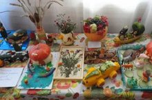 В нашем детском саду прошла выставка поделок из природного материала, овощей и фруктов «Дары осени».На выставке можно было увидеть много разнообразных красочных букетов и цветочных композиций. Каждая работа – шедевр! Практически для каждого букета была изготовлена необычная ваза: из тыквы, кабачка, шишек и др. Все букеты были украшены бусами рябины и гирляндами ранеток, сухими листьями и цветами, еловыми шишками, а также другим подручным природным материалом. Помимо цветов, манящих своим сладким ароматом, можно было увидеть множество поделок из различных овощей. Все поделки отличались особой фантазией и выдумкой. Не меньше внимания привлекли к себе и цветы, сделанные искусственно, но так искусно. Розы из листьев клена, тюльпаны из болгарских перцев удивили и порадовали всех посетителей выставки. Самыми требовательными зрителями оказались, конечно же, дети. Дружная семейка из тыквы зажгла огоньки в глазах ребят и вызвала радость и удивление. Не остались равнодушными к чудесным поделкам и взрослые – родители, педагоги и гости. Выставка порадовала большим количеством работ, выполненных на высоком уровне.