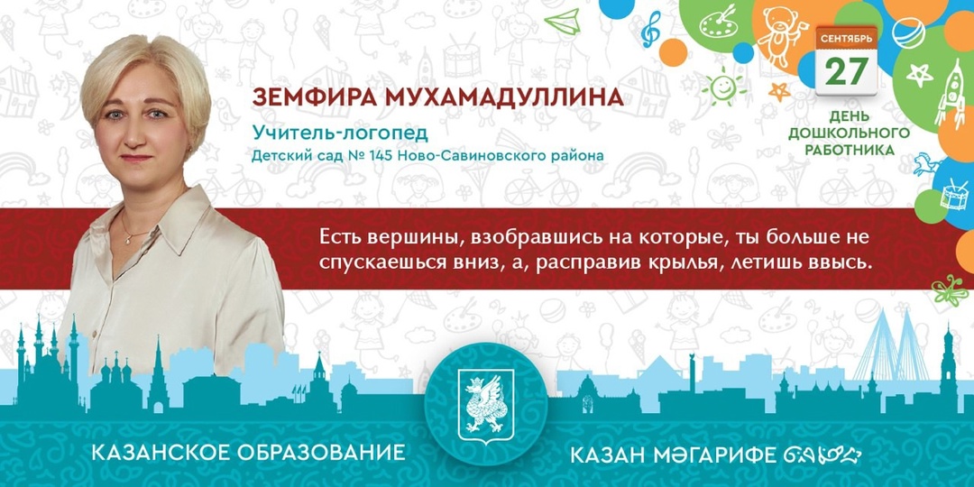 В честь праздника День дошкольного работника размещены билборды с фотографиями наших коллег на улицах города Казани. На одном из билбордах вы можете встретить нашего всеми уважаемого учителя-логопеда Земфиру Зифаровну Мухамадуллину. Гордимся! Желаем успехов и процветания в дальнейшем.
