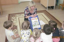 На фоторгафии воспитатель средней группы № 12 Елена Владимировна Федотова со своими воспитанниками играет дидактическую игру "Бу кем?" -"Кто это?". ( с элементами УМК по обучению двум государственым языкам)