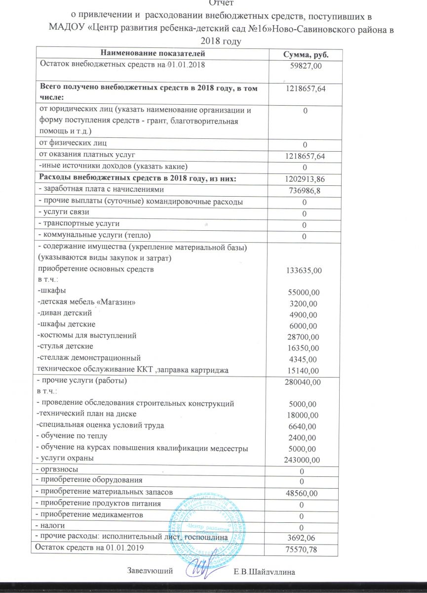 Отчёт о привлечении и расходовании внебюджетных средств МАДОУ 16 - 2018 г