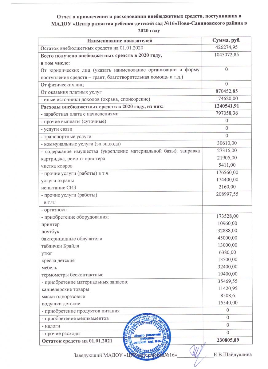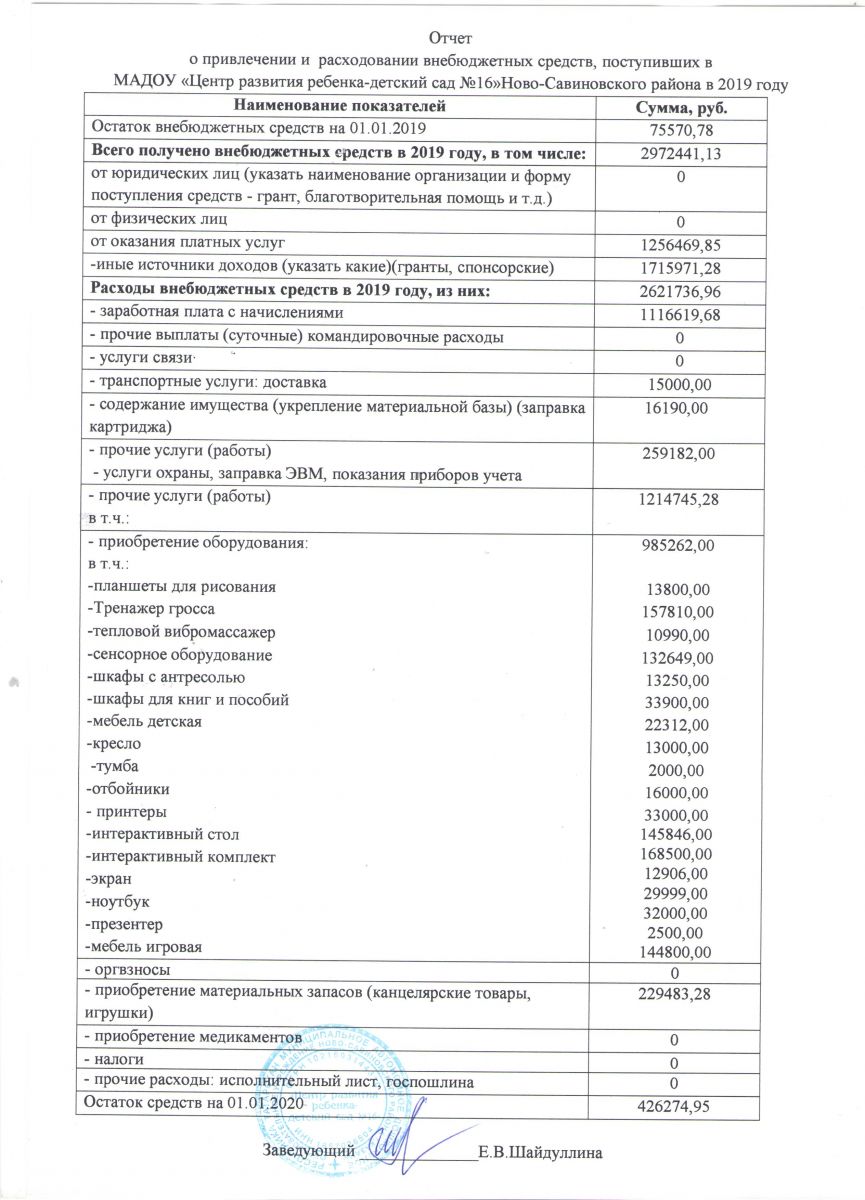 Отчёт о привлечении и расходовании внебюджетных средств МАДОУ 16- 2019 год