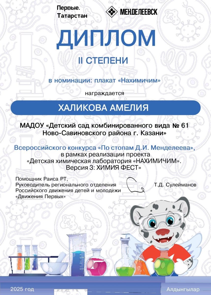 Наши талантливые юные химики одержали блестящую победу на Всероссийском конкурсе «По стопам Менделеева», завоевав второе призовое место. Это выдающееся достижение стало возможным благодаря упорству и стараниям воспитанников нашей детской химической лаборатории «НАХИМИЧИМ», работающей совместно с проектом «Движение первых». Такой успех служит ярким примером стремления юных исследователей к познанию химии и открывает перед ними новые горизонты научных открытий