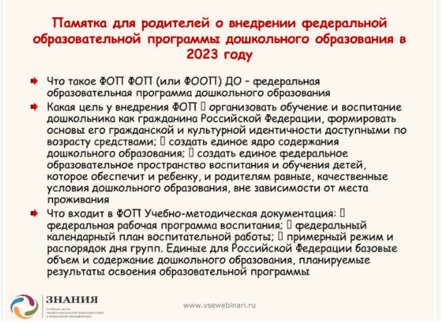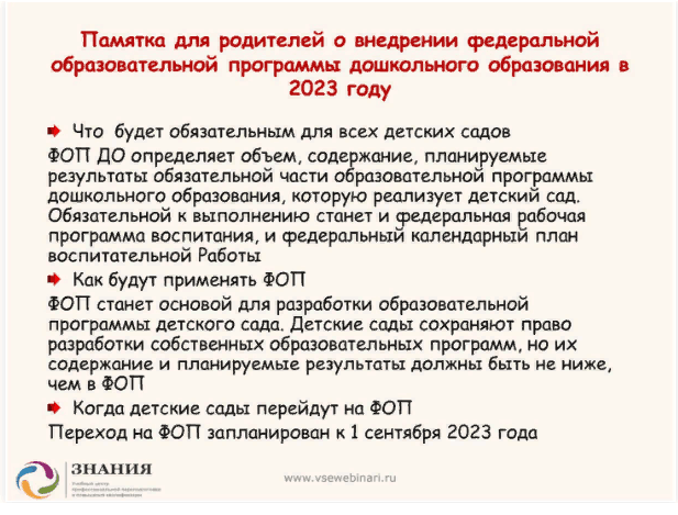 Уважаемые родители, информируем Вас о том, что с 01 сентября 2023 года все детские сады переходят на работу по новой Федеральной образовательной программе дошкольного образования.