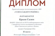 Поздравляем Крыева Салима со 2 местом за участие в городском конкурсе «Успех каждого ребёнка», и с 1 местом за участие в районном этапе конкурса, в номинации "Пластилинография"
