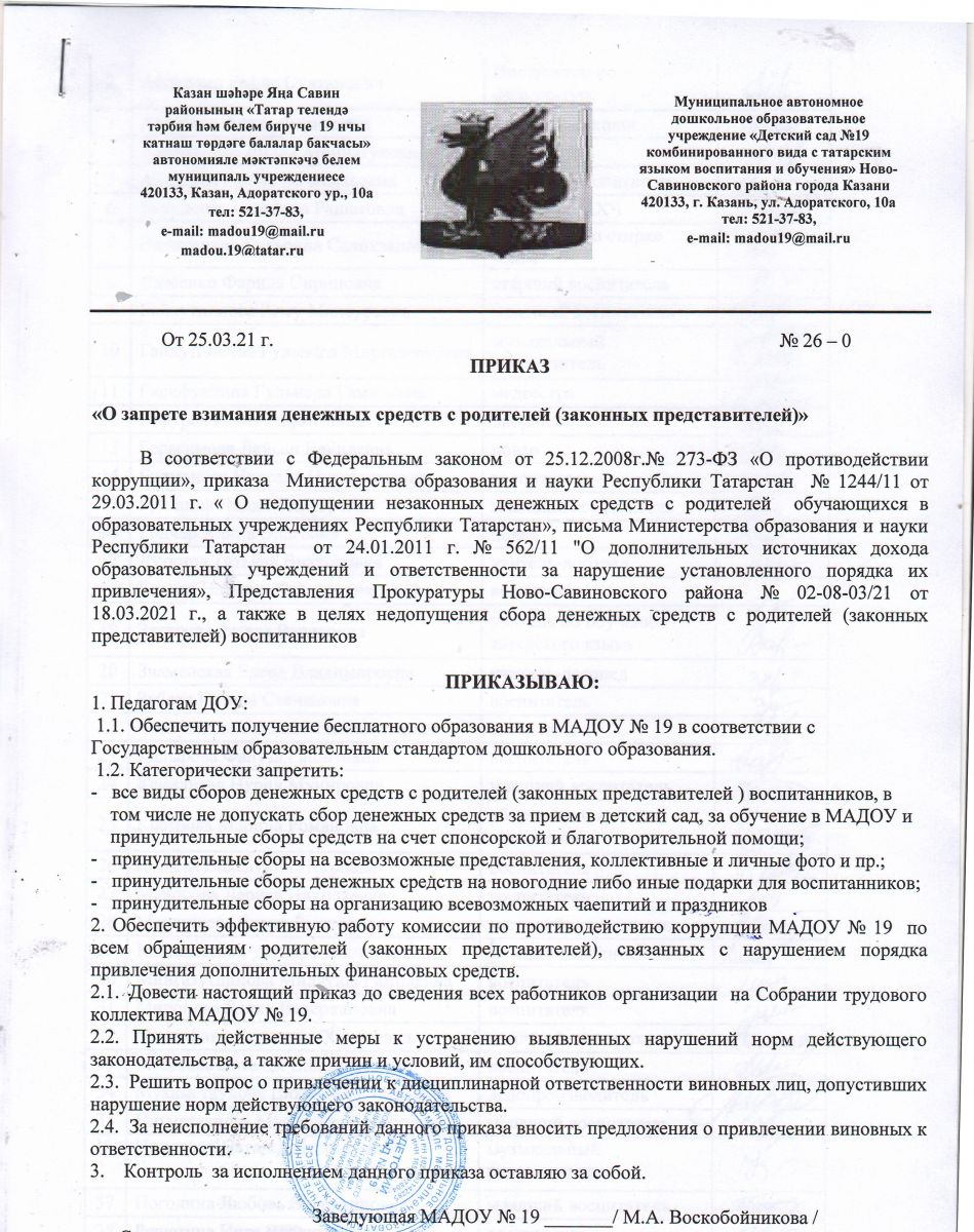 Приказ " О запрете взимания денежных средств с родителей (законных представителей)" от 25.03.2021 г.