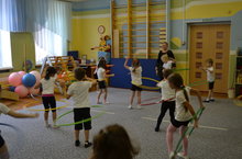На занятии по физической культуре, вместе с инструктором Ольгой Викторовной, дети старшей группы № 7 , отрабатывали упражнение - вращения обруча.