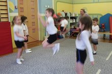 Дети подготовительных к школе групп учатся прыгать через длинную скакалку.