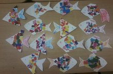 Цель: продолжать знакомство с миром рыб; аккуратно наклеивать чешуйки, располагая на туловище рыбки. Дополнять аппликативное изображение графическими приёмами (дорисовать глаз, полоски на плавниках)