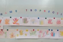 Дети положили на лист бумаги ладони своих рук с раскрытыми пальцами и обвели их карандашом. Потом контуры рук преобразились в листья деревьев, засияли цветами золотой осени - красным, жёлтым, оранжевым и пурпурным. -