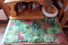 16 апреля воспитатели группы №14 совместно с детьми изготовили коврик «Весенние мотивы» для игрового уголка "домашние животные" в технике мокрого валяния. Ребята принимали участие в подготовительном этапе работы, наложении шерсти.