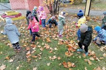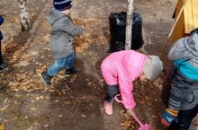Ребята младшей группы № 3 вместе с воспитателями убирали на участке опавшие листья. Все хотели помочь и поучаствовать в уборке.