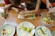 Ребята подготовительной к школе группы № 9 на время стали поварами и придумали свои картинки из овощей и фруктов. Сделали вывод, что красиво украшенное блюда радует глаз, хочется скорей его попробовать, от него улучшается настроение.