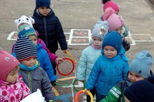 Не секрет, как сложно организованно вывести детей раннего возраста на прогулку: Внимание их неустойчиво, по пути к площадке они отвлекаются на любой заинтересовавший их обьект. Эту задачу педагоги грумы раннего возраста решили с помощью игры " Веселый паровозик". Наш волшебник паровозик построен из веревочки и ярких разноцветных колец, закрепленных попарно. Игра выступает и как мотивация для сборки на прогулку: " Паровозик должен отправиться без опозданий". Детки с удовольствием занимают посадочные места, берутся за кольца и под песенку " Мы едем, едем, в далекие края.." отправляются к игровой площадке. -