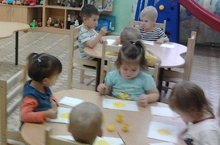 Цель : Создавать у детей радостное настроение , учить рисовать пятном солнечных зайчиков, продолжать учить правильно держать кисточку , обмакивать ее в краску.
